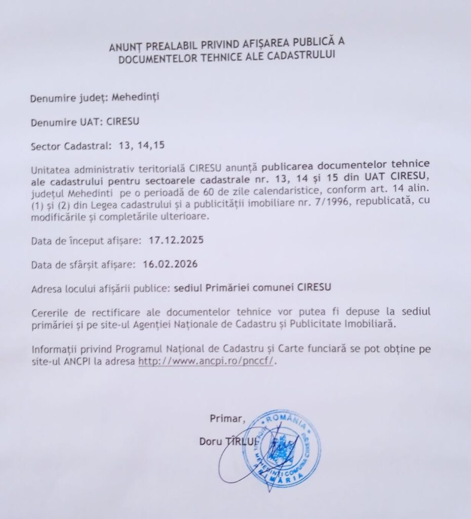 ANUNȚ PREALABIL PRIVIND AFIȘAREA PUBLICĂ A DOCUMENTELOR TEHNICE ALE CADASTRULUI