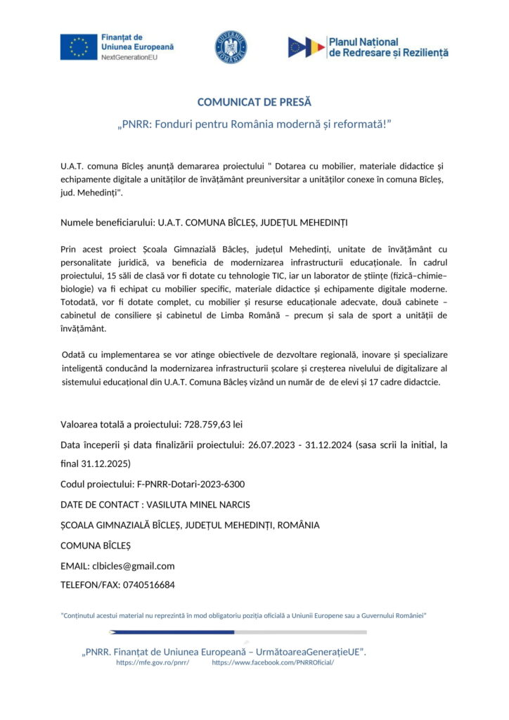 Comunicat de presă demarare proiect 31 octombrie 2023 By Briceag Voica Share FacebookTwitterPinterestWhatsApp Briceag Voica Articole noi Comunicate de presă COMUNICAT DE PRESĂ-„PNRR: Fonduri pentru România modernă și reformată!” Fără categorie Anunţ public privind depunerea solicitării de emitere a acordului de mediu Comunicate de presă https://dinmehedinti.ro/anunt-public-privind-depunerea-solicitarii-de-emitere-a-acordului-de-mediu-9/ Comunicate de presă Anunţ public privind depunerea solicitării de emitere a acordului de mediu Comunicate de presă Anunț public Noutăți Comunicate de presă COMUNICAT DE PRESĂ-„PNRR: Fonduri pentru România modernă și reformată!” Fără categorie Anunţ public privind depunerea solicitării de emitere a acordului de mediu Comunicate de presă https://dinmehedinti.ro/anunt-public-privind-depunerea-solicitarii-de-emitere-a-acordului-de-mediu-9/ Comunicate de presă Anunţ public privind depunerea solicitării de emitere a acordului de mediu