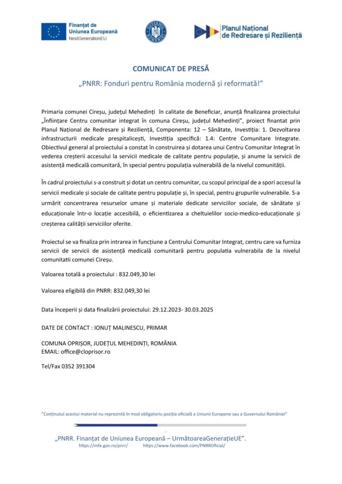 Comunicate de presă COMUNICAT DE PRESĂ FINALIZARE PROIECT PNRR- ÎNFIINȚARE CENTRU COMUNITAR COMUNA OPRIȘOR 19 martie 2026 By Briceag Voica Share FacebookTwitterPinterestWhatsApp Briceag Voica Articole noi Comunicate de presă Comunicat de presă finalizare proiect PNRR Comunicate de presă COMUNICAT DE PRESĂ-„PNRR: Fonduri pentru România modernă și reformată!” Comunicate de presă COMUNICAT DE PRESĂ-„PNRR: Fonduri pentru România modernă și reformată!” Comunicate de presă Anunț public privind decizia etapei de încadrare-titular S.C. MEHEDINȚI GAZ S.A. Comunicate de presă Anunț public privind decizia etapei de încadrare – titular S.C. MEHEDINȚI GAZ S.A. Noutăți Comunicate de presă Comunicat de presă finalizare proiect PNRR Comunicate de presă COMUNICAT DE PRESĂ-„PNRR: Fonduri pentru România modernă și reformată!” Comunicate de presă COMUNICAT DE PRESĂ-„PNRR: Fonduri pentru România modernă și reformată!” Comunicate de presă Anunț public privind decizia etapei de încadrare-titular S.C. MEHEDINȚI GAZ S.A.